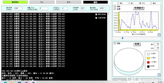 另一个测试是延迟测试,用的是个比较简单的粗暴的方式,ping百度。使用Network Pinger软件持续ping500次以上,软件可以记录ping的延时大小并且对于延时过高的情况用特殊的颜色标注。