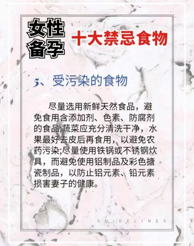 5. 重金属污染:一些重金属如铅、汞和镉可能对人体和生殖系统产生危害。在备孕期间,应避免食用含有这些重金属的食物,如某些鱼类(如鲨鱼、剑鱼和金枪鱼)和含有重金属镉的矿石。