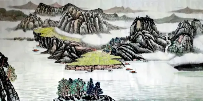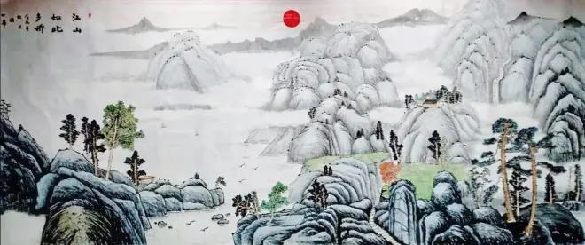 山泉瀑布,是胡先生画作的又一亮点。画面之水,因溪而动,因泉而声,因瀑而宏,因山而灵。山石因水陡增活力,画面因水顿生空灵。依宋朝画家郭熙于《山泉高致》画论鉴丹青——“山以水为血脉,以草木为毛发,以烟云为神形,故,山得水而活,得草木而华,得烟云而委媚。水以山为面,以亭榭为眉目,以渔钓为精神,故水得山而媚,得亭榭而明快,得渔钓而旷落,此山水之布置也”。胡氏山水,中规中矩,佼佼为范也。