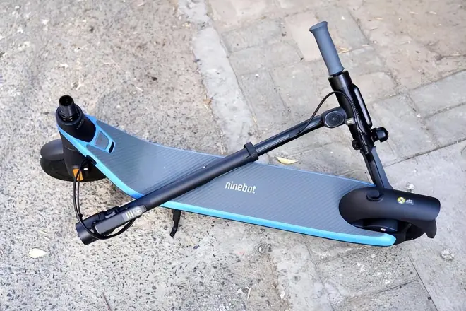滑板车在箱中的状态基本已经是完全体,被塑料保护套紧紧包裹,防止在运输途中划伤。取出时切记用蛮力,否则会损伤连接车把和踏板的刹车和控制线。