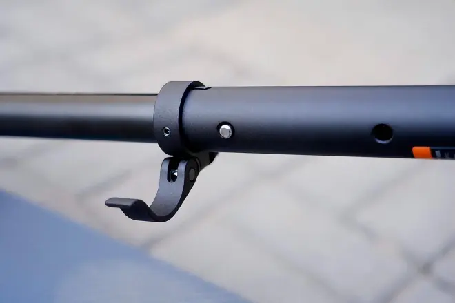 车把下方加入锁扣结构实现一键折叠,细节方面彰显九号的用心,锁扣结构的侧面设计了保险装置,只有用力往下推才能释放锁扣。且释放后的锁扣有限位,避免车把直接砸到踏板损坏上方的显示屏。