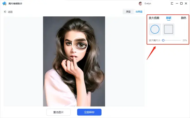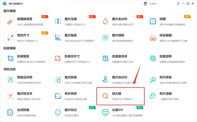 步骤1:打开图片编辑助手软件,在下方找到“放大镜”选项,点击进入。
