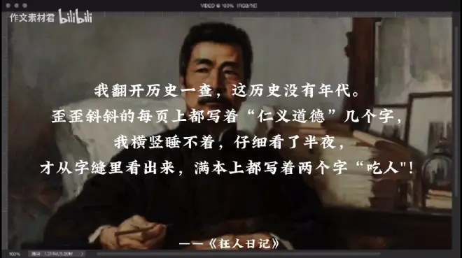 我翻开历史一查,这历史没有年代。歪歪斜斜的每页上都写着“仁义道德”几个字, 我横竖睡不着,仔细看了半夜,才从字缝里看出来,满本上都写着两个字“吃人"!