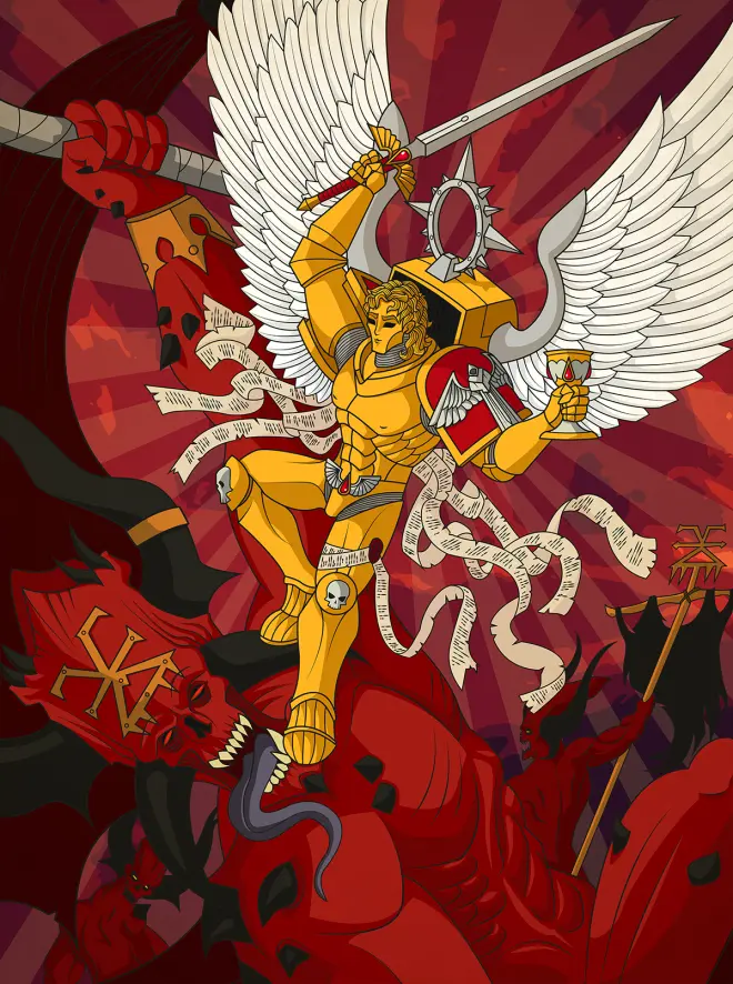 后面一种说法似乎不太可信,因为虽然圣血天使战士的平均寿命在众星际战士中比较突出*审判庭警觉*,但即使是他们也无法在不进无畏机甲的情况下活过一万年。不过还是有一些个例存在,比如身负原体剑!双枪辩忠奸的...!*BANG!*火蜥蜴战团曾在2009年的小说《火蜥蜴》找回过一位大远征时期的老前辈,2015年的小说《潘多拉》也提到过有一位首批灰骑士的成员守卫着一座混沌之门,这老哥甚至说自己见过帝皇本人。再加上亚空间没有时间的概念,圣吉列诺真的是阿兹凯隆也说不定。当然还有一种会让审判庭的异端指数检测机发出警报的说法:圣吉列诺是因圣血天使们极度想念他们亲爱的父亲圣吉列斯而诞生的亚空间生物。