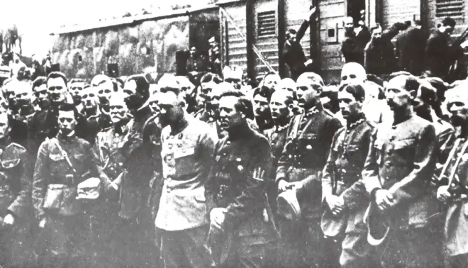 两位著名人物的会面:1920 年9 月5日, 波兰的约瑟夫• 毕苏茨基和乌克兰的西蒙• 彼得留拉在斯坦尼斯瓦沃夫(Stanislawow,今伊万诺- 弗兰科夫斯克)出席了乌克兰装甲列车“卡梅柳克”(Кармелюк)号的服役仪式,该列车在当地的铁路工厂建造。(照片:克日什托夫• 马尔加辛斯基的收藏)
