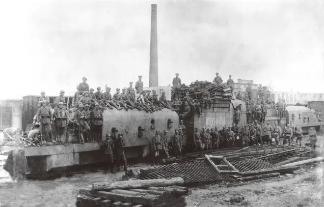 1917 年6 月23 日,乌克兰民族共和国6 宣布成立。在俄国革命后的一段时间里,它成了苏俄的一部分。多列装甲列车在此运行,质量各异,有临时拼凑的车厢,也有敖德萨等地海军工厂建造的车辆,还有从布尔什维克及邓尼金白军手中缴获的做工精良且装甲厚重的单元。
