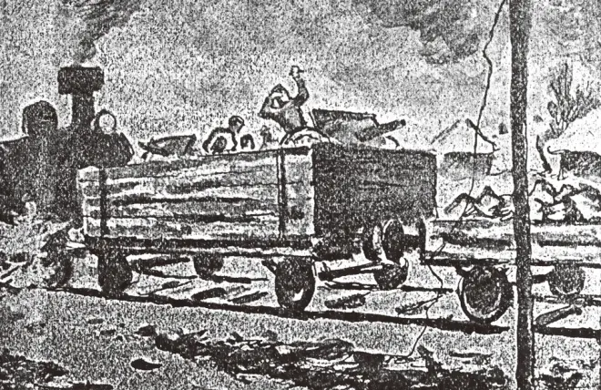 展示UHA 列车上类似火炮的木刻画,它正在向开来的波兰装甲列车射击。(木刻:亚历山大• 迪迪克的收藏,照片提供人是克日什托夫• 马尔加辛斯基)