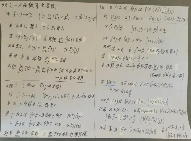 Moore-OSgood定理(累次极限换序)(p6,7) (引理1)重极限存在,累次极限存在则两者相等(p7) 两个累次极限与重极限存在则三者相等(p8) 两个累次极限不同,则重极限不存在(p8) p1:
