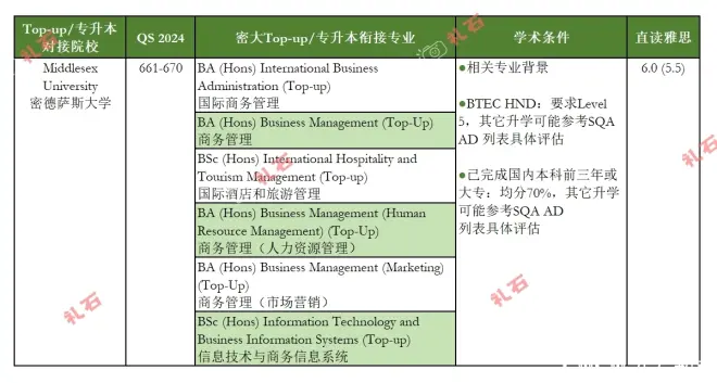 近期整理一下英国本科最后一年插读/专升本Top-up系列,大概会整理10所左右,应该足够大家参考。 如果你正在读SQA AD, BTEC HND,2+2,3+1等项目,或者希望通过读完大专后到英国完成专升本,而且之后要继续申硕士学位课程的,可以follow一下。2+2的升学不在本文讨论范围之内。 本篇关注:Middlesex University 密德萨斯大学 密德萨斯 SQA AD/HND Top-up或专升本的专业对接选择还是算比较多的,而且地理位置不错,可以考虑。 具体要求参考 图2:密大提供给SQA AD学生衔接本科最后一年的专业选项和申请要求; 图3:密大提供给大专毕业生衔接本科最后一年的专业选项和申请要求,如不在此列表的专业但希望考虑升学可能的,参考SQA AD 列表再作具体评估。 下面是申请过程中你可能需要考虑的环节和准备的任务。有协助申请需求的同学也可以直接私信,我们会为你做专升本以及申硕的整体规划、提供客观的建议和申请指导。 Top-up/专升本申请一般包含: ✅ 各院校对接专业选项 ✅ 学术成绩和语言要求 ✅ 语言班选项 ✅ 客观的申请定校建议 ✅ 申请辅导和递交 ✅ 客观的择校建议 ✅ Offer、CAS、行前 硕士申请一般包含: ✅ 申请时间线安排及建议 ✅ 硕士专业方向探讨 ✅ 课程研究和首批筛选 ✅ 研究List和入学要求 ✅ 客观的申请定校建议 ✅ 申请辅导和递交 ✅ 客观的择校建议 ✅ Offer、CAS、行前 #英国topup# #英国专升本# #英国本科插读# #2024fall# #2025fall# #topup申硕# #topup# #英国本科申请# #英国硕士申请#