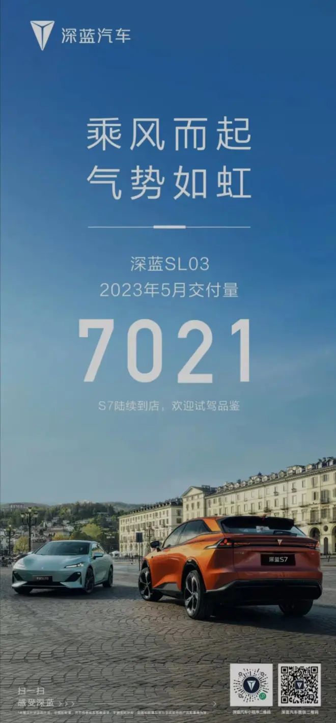 TOP8 深蓝:7021辆,环比下跌9.48%,深蓝汽车在5月份交付了7021辆SL03车型。凭借一款车型,深蓝汽车的销量已经领先了许多新能源汽车品牌。5月20日推出了第二款车型深蓝S7的预订,官方预订价格介于16.99万元至23.99万元之间。