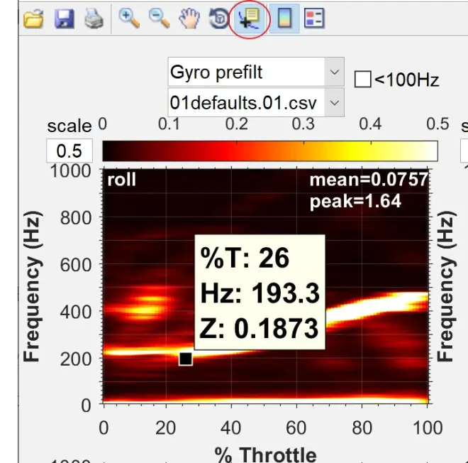 再次进行油门巡行试飞(throttle sweep)并检查"freq vs throttle"热图。
