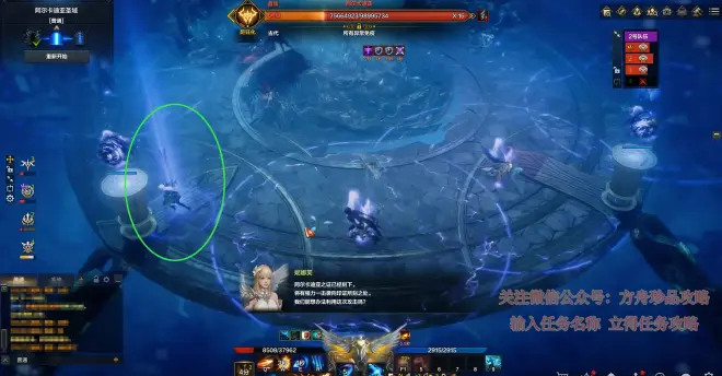 阿尔卡迪亚P2:第三个boss位移和攻击非常多,在挑战时优先躲避技能,过多玩家阵亡会导致没有足够效率度过团灭机制。比较致命的攻击有boss引发范围波浪攻击,禁锢一名玩家,随后对该玩家投矛攻击,伤害接近秒杀,被禁锢的玩家需要队友的多段攻击救助。注意,解救队友后boss照样会朝禁锢所在的位置发动投矛攻击,近战角色救完队友后要立刻远离该位置