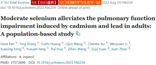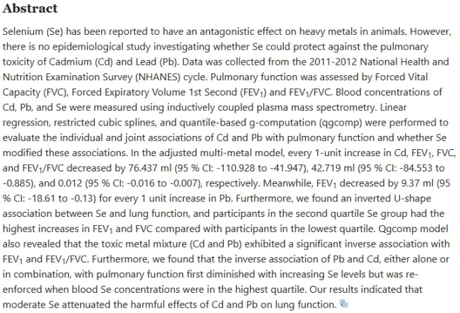 文章题目:适量硒可减轻成人镉和铅引起的肺功能损害:一项基于人群的研究