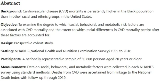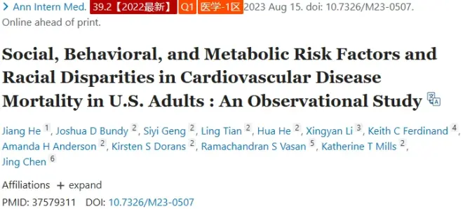 文章题目:美国成人心血管疾病死亡率的社会、行为和代谢危险因素和种族差异:一项观察性研究