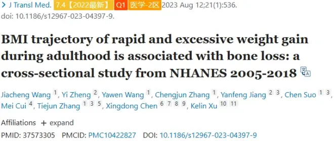 文章题目:成年期体重快速和过度增加的BMI轨迹与骨质流失有关:来自NHANES 2005-2018的横断面研究