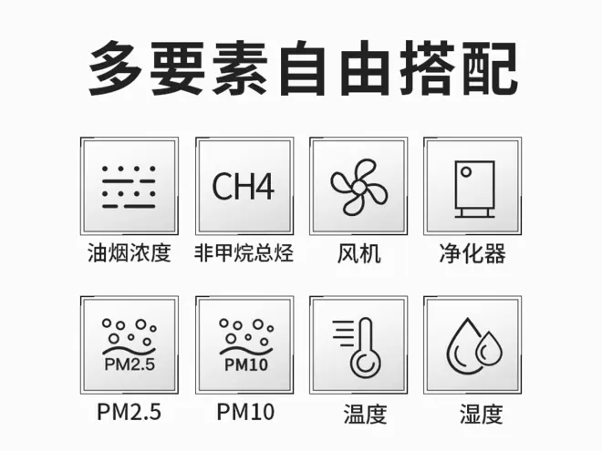 油烟在线监测设备:方案采用了电化学和激光散射原理的油烟在线监测仪,可以同时监测油烟浓度、颗粒物浓度、非甲烷总烃浓度等参数,具有高精度、高稳定性、低维护等优点。该设备已通过CCEP认证和CMA认证,符合国家技术要求 。该设备安装在餐饮企业的排烟管道上,通过抽取式采样方式 ,避免了烟道内环境对数据的干扰。该设备使用油烟专用激光传感器,可以检测出油烟浓度指标及颗粒物(PM2.5)浓度指标。