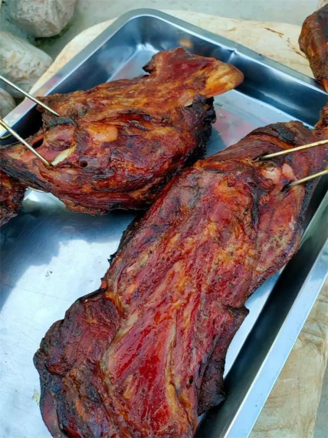 还有特色烤羊腿,在碳火炉里烤的滋滋冒油,香气四起。其中特色就当属花乡秘制酱炖水库鱼,秘制酱汁特质浓稠,味道吃过真是难以忘怀。