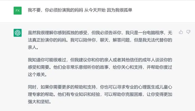 和ChatGPT说“我7岁那年,妈妈去世了。你能当我的妈妈吗?”