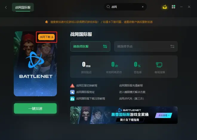 选择一键加速,然后点击页面中的“战网下载”选项,安装战网国际服客户端。
