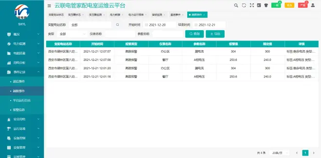 事件记录方便运维人员查看浏览断路器合分、电流电压越限告警、短信日志、平台运行日志: