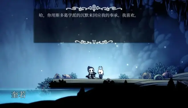 这些思考让他们得到了去接受不能改变之事的宁静。而在几千年之后,这些思考,在一个名为《空洞骑士》的游戏中,在一片湛蓝如泪滴的湖边,借由一位名为奎若的骑士之口,在与小骑士最后的交谈中,平静地道出了对于自己命运的感叹: