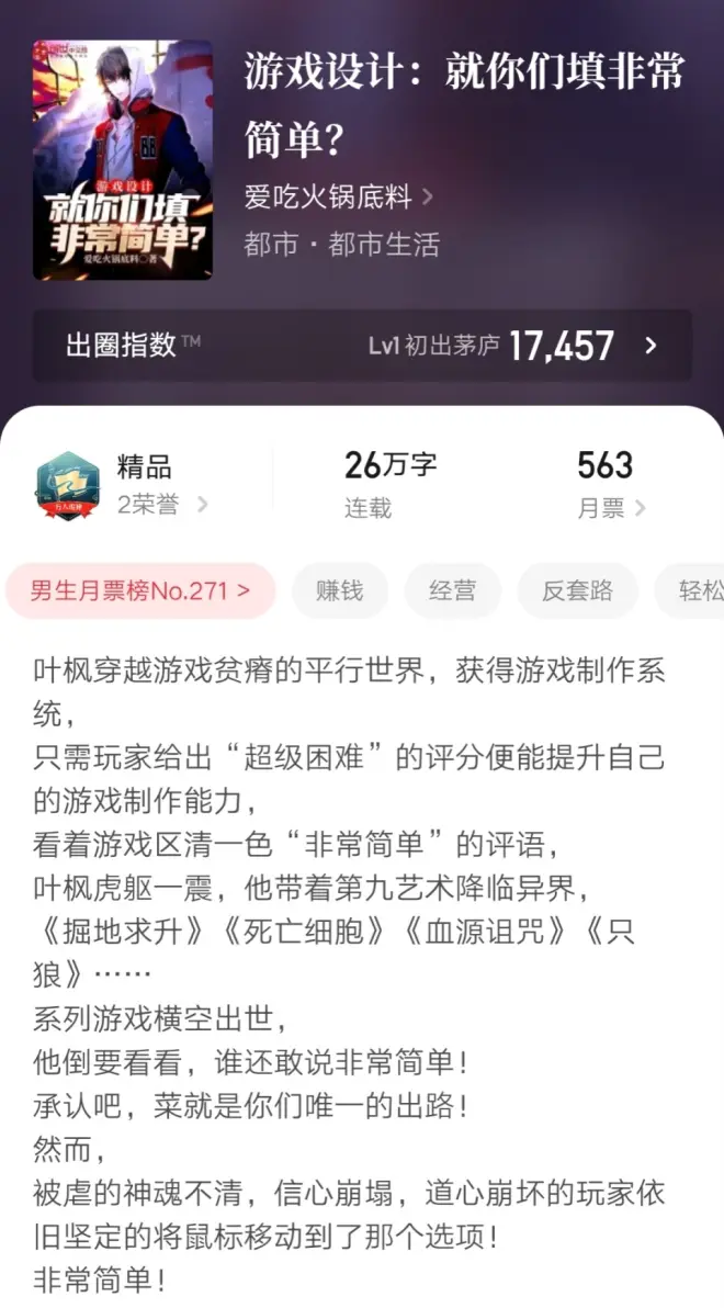 小说名《游戏设计:就你们填非常简单?》六万字的时候就上架了,在创世感觉没啥成绩,反倒在作为渠道的起点杀出来一条路,属实让人没想到。