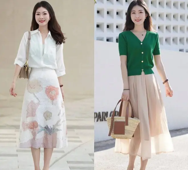 优雅妩媚的窄腰雪纺裙、时髦的薄款镂空裙、甜美靓丽的A字娃娃裙、素净简约的T恤裙等等,各式各样的裙子打造出不同的造型。女孩子不要太执着于某条裙子,这样看起来颜色更鲜艳。