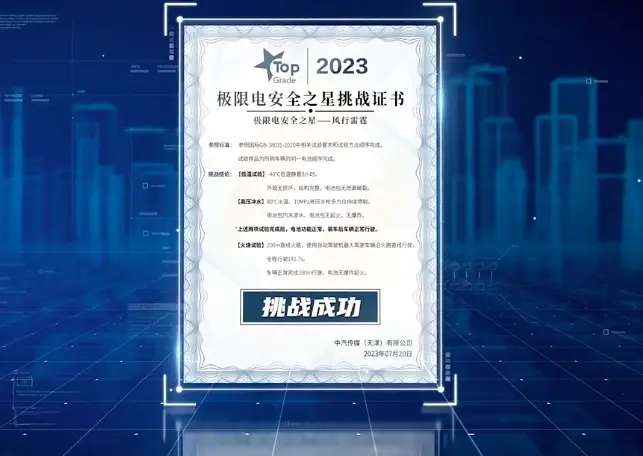 此次挑战过程中,风行雷霆以4km/h的平均时速在200m长、30cm宽的火路上,使用自动驾驶机器人行驶,以检验铠甲电池耐火安全性。期间,车辆行驶稳定,车内没有出现任何警报,即便车身外围塑料件已经变形,但电池系统没有出现任何热失控现象,整车的状况非常好,最终风行雷霆完成了挑战,荣获由中汽中心颁发的“极限电安全之星”荣誉认证,展现出铠甲电池强悍的电池安全性。