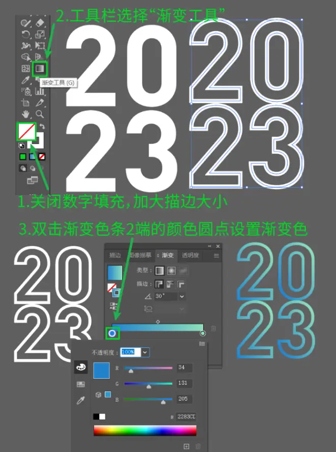 关闭数字填充,加大描边大小,工具栏选择“渐变工具”,点击色条下方的颜色圆点选择颜色,给数字描边添加渐变色。