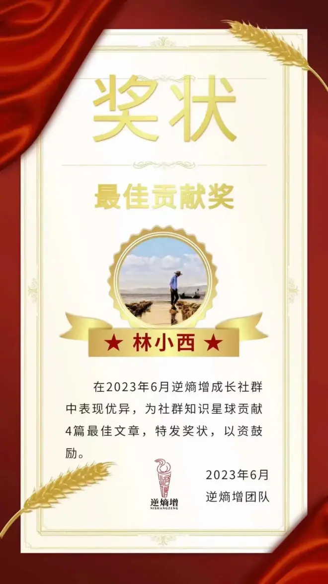 四、荣获逆熵增成长社群知识星球6月最佳贡献奖