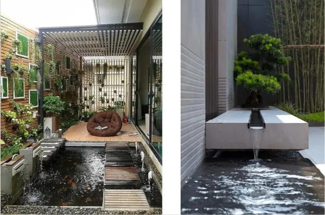 6. 水景与绿植的和谐共生:在花园露台上设置一个小型的水景,如喷泉或小池塘,与绿植相互映衬,营造出宁静而舒适的氛围。在这里,您可以静静地欣赏水的流动,感受大自然的魅力。