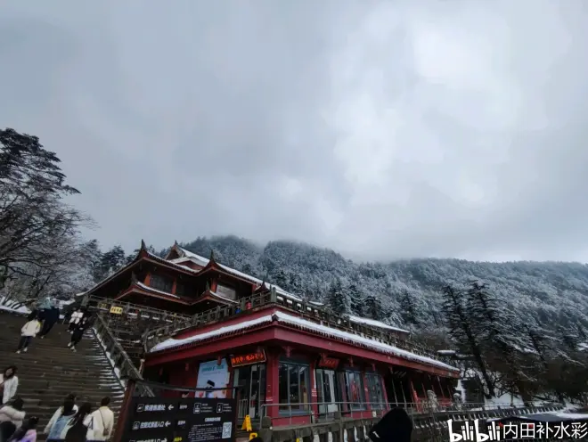 2 高铁站门口就可以买门票、往返大巴和索道的票(自由可选,索道有两段:金顶索道、万年索道)。门口有直达【报国寺/黄湾】、【雷洞坪】的接驳车。 3 直接上去【雷洞坪】的接驳车,经过2h漫长路途,到达【雷洞坪车站】。这里海拔2430m,2月份山上还有积雪,时不时还飘着雪花