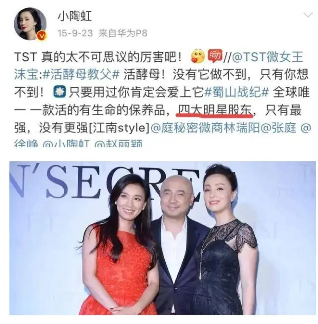 值得关注的是,TST宣传徐峥陶虹夫妇都是其公司的联合股东,徐峥陶虹夫妇也多次为其站台。张庭的好闺蜜陶虹更是通过工商登记成为其股东(直接持股1.9301%,通过独资公司北京最陶然服装服饰有限公司间接4.7049%),因为去其公司站台,被很多员工称为“二老板”。
