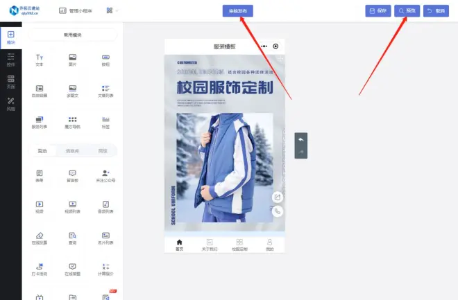 当我们完成了编辑后,可以点击预览来确认无需再进行修改。在确认之后,我们可以将小程序提交审核,等待上线。通过审核后,我们的服装定制小程序将正式上线,可以供广大用户使用。