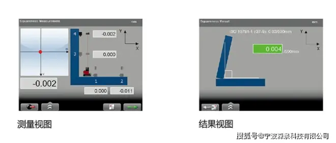 当测量直角时,首先在X方向上测量两点并记录,然后使用激光发射器D22内置的棱镜,使激光束偏转90度,在Y方向上测量两点并记录,测量值转换为角度值,显示为X与Y方向上的偏差。