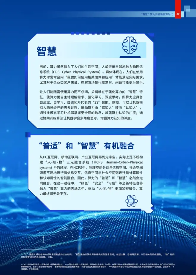毕马威中国首席经济学家康勇指出:“‘普适’强调以自然交互的方式提供算力,‘智慧’强调以认知驱动的方式提供算力,对于构建‘人-机-物’三元融合系统来说,算力的‘普适’和‘智慧’必然会走向融合,在这一过程中,‘绿色’‘安全’‘可信’等全新特征也将融入‘普慧’算力的内涵之中,驱动‘人-机-物’更加紧密融合,算力最终将无处不在。”