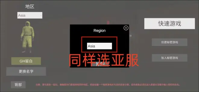 ③【地区】这里也要选Asia(亚服),要和朋友在一个服务器才能联机