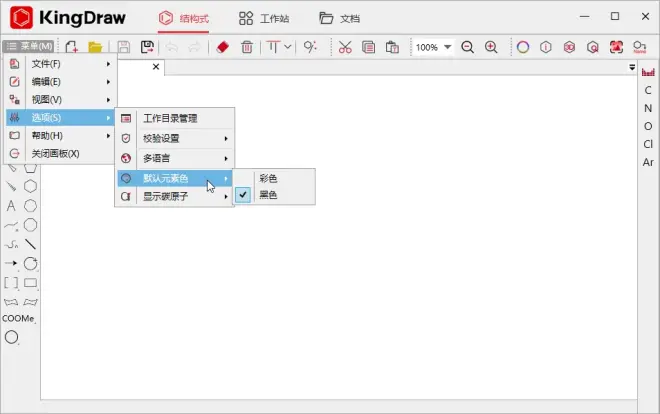 在KingDraw PC端中,通过上工具栏的【菜单】→【选项】→【默认元素色】就可以进行设置。选择彩色,绘图时添加的元素会根据系统设置,显示为不同颜色;选择黑色,添加的元素将全部显示为黑色。