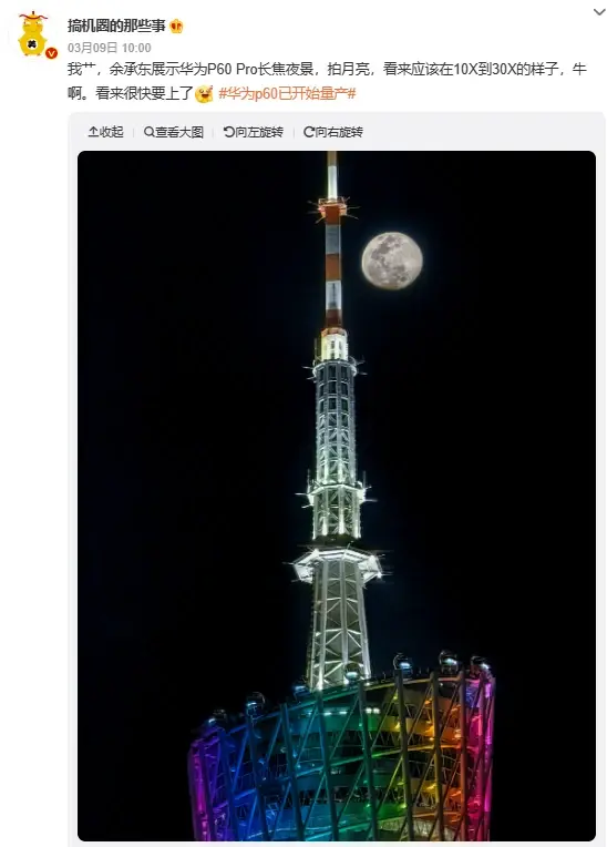 最近华为常务董事余承东展示的华为P60 Pro长焦夜景也是非常让我们震惊,居然可以把广州塔和月亮都拍得很清晰,真的是绝了。