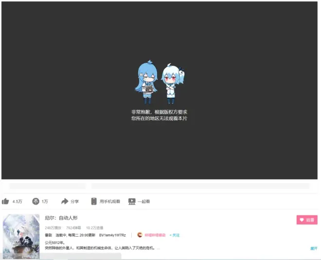 万众瞩目的尼尔:自动人形更新第二集啦!作为一款神作游戏漫改动漫,尼尔:自动人形绝对是今年期待值很高的动漫之一。更别说原作尼尔:机械纪元也一直在和各大厂商联动,比如前段时间的永劫无间联动就让玩家们狠狠地震撼了一波!这无疑让很多没有玩过原作的小伙伴们也开始关注本作!不过本次的动漫是哔哩哔哩独家播放的,虽然提供了极高的画质和观影体验,但是这也让海外的小伙伴们因为版权问题不能观看。不过这也是有办法解决的!接下来就让我们一起看看吧。