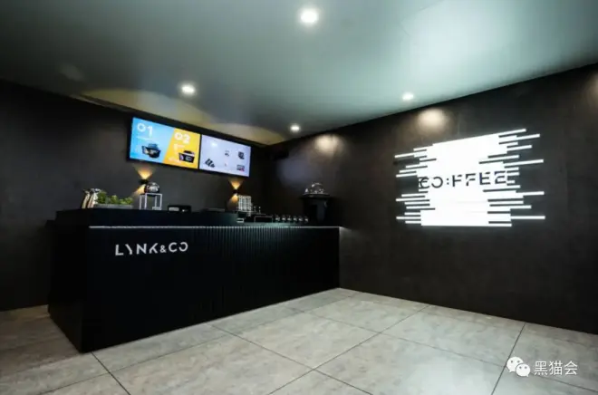 领克还在二层空间为车主们准备了一个暗黑系的餐饮休憩区,CO:FFEE,正也呼应了领克的英文LINK&CO。