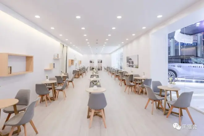 休憩区地装修风格也是继续暗黑,还细心地准备了不同车型的咖啡杯套供客户拿取。