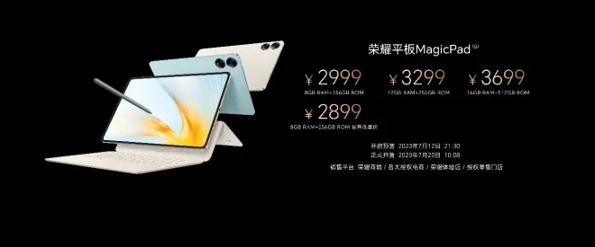 此次荣耀平板MagicPad 13共推出8GB RAM + 256GB ROM、12GB RAM + 256GB ROM、16GB RAM + 512GB ROM三个版本,预售价2899元起。