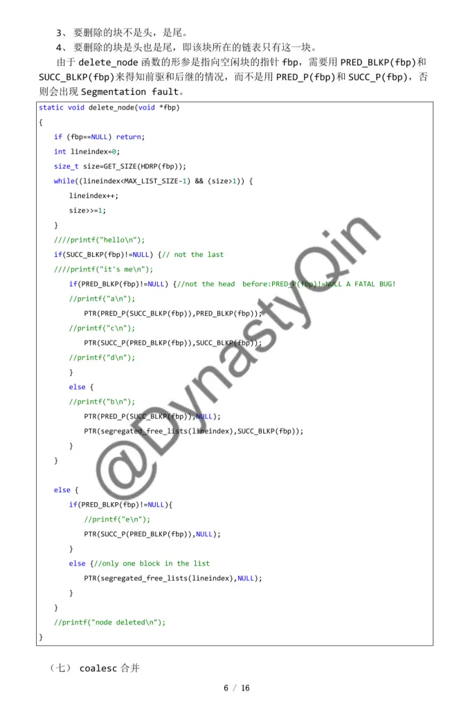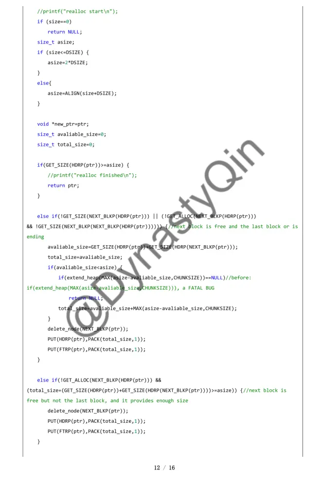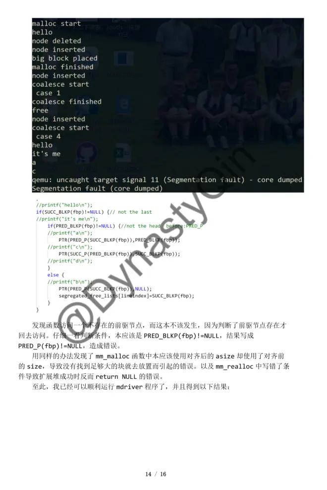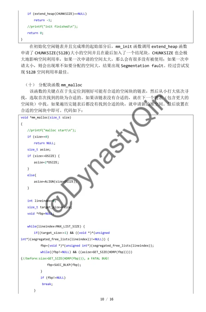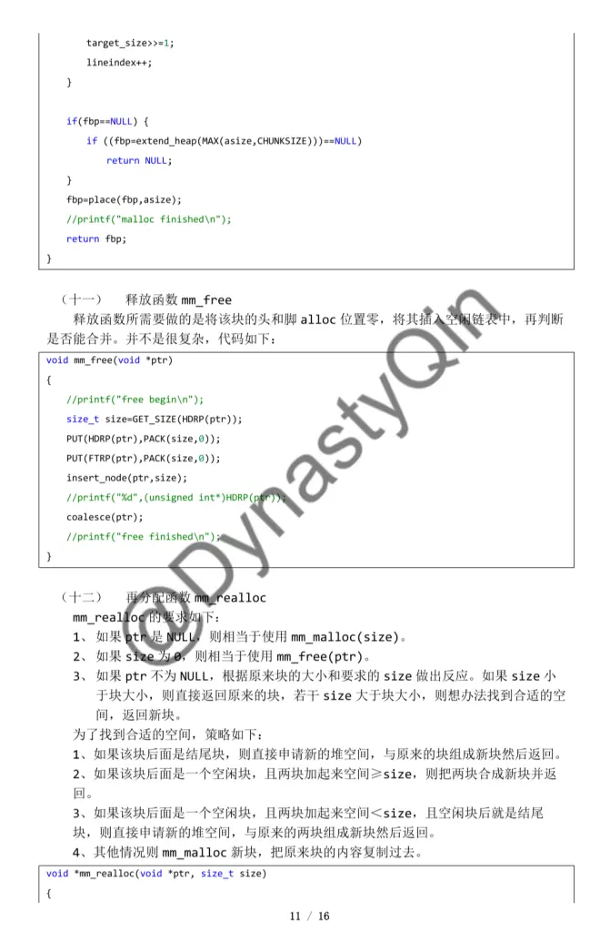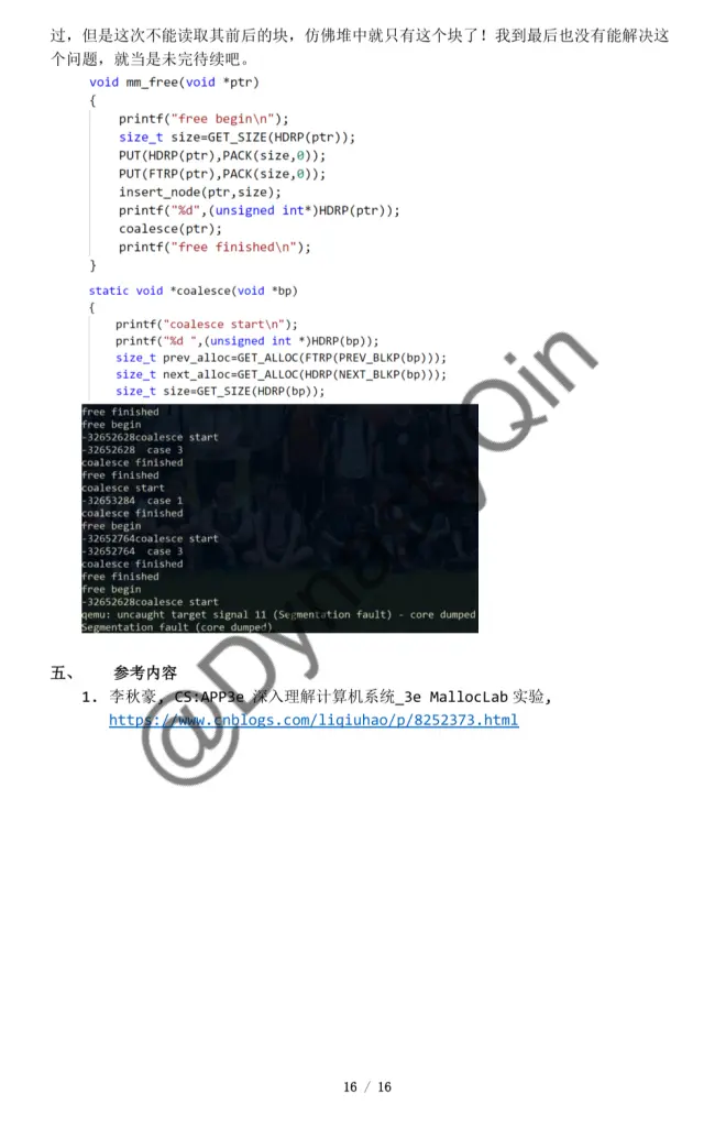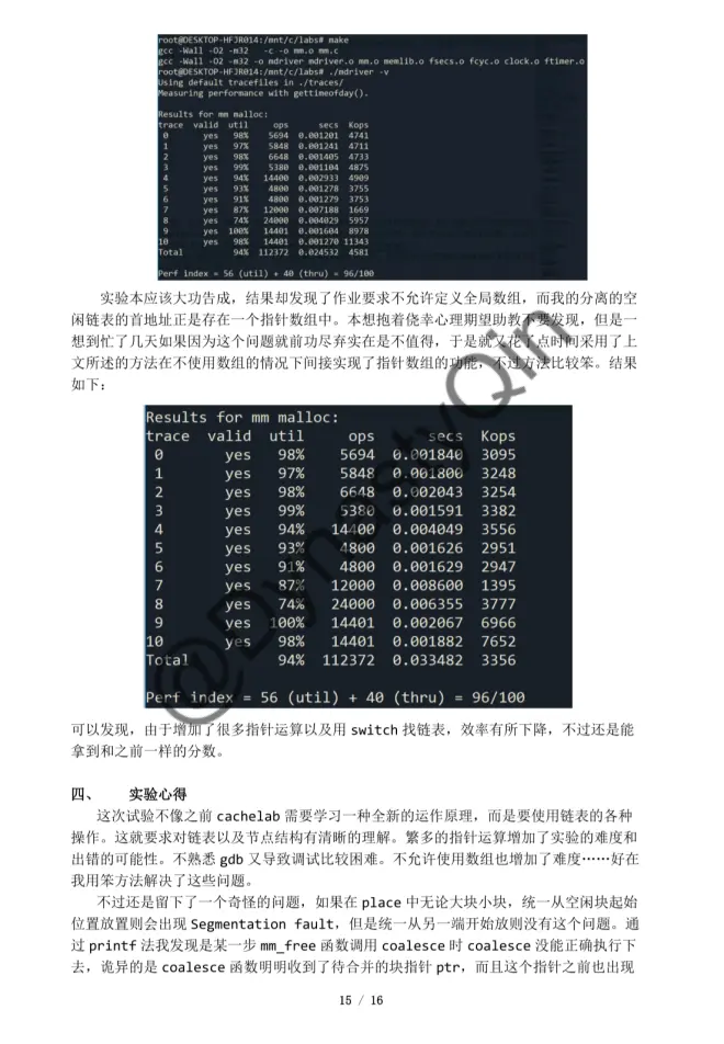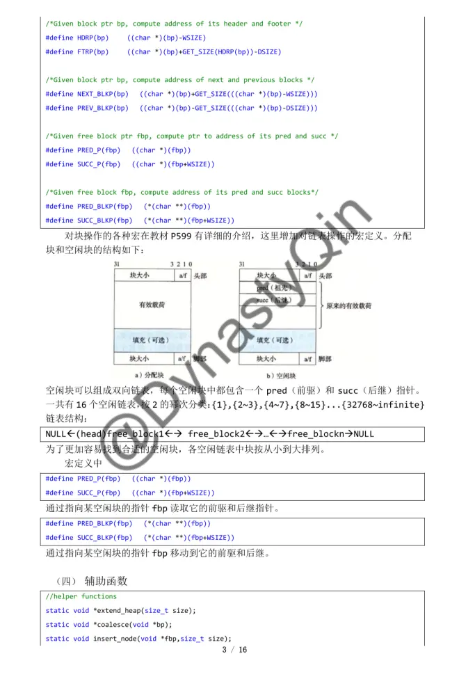 今天的报告是malloc lab,要求我们自己写一个动态内存分配程序,完成malloc、free等功能。由于需要提高内存的使用率与操作效率,我选择分离的空闲链表来管理内存块。数据结构上就是几个双向链表,不是很困难。实验要求不能使用数组,这一点真是麻烦,害得我手动定义了16个链表头指针。