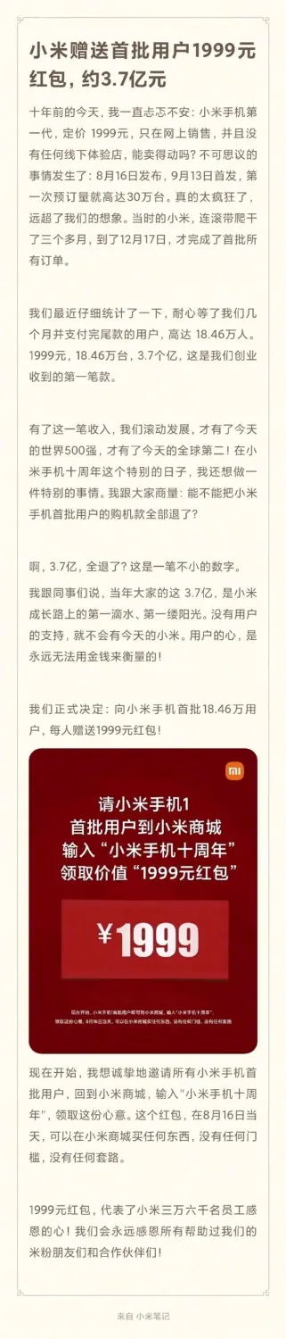 雷军返还10年前小米手机1999元购机款!首批用户领走2亿红包