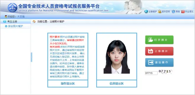 ④ 制作完照片后,进入报名系统点击【打开照片】按钮选择经过【照片审核处理】工具处理过的照片,输入验证码,点击【上传照片】按钮,照片会显示在上方,照片就上传成功啦!
