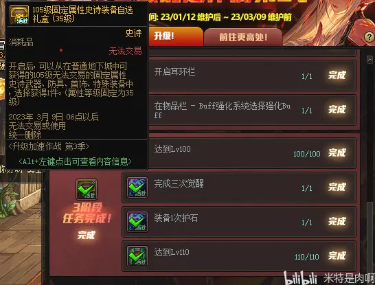 这样一套操作下来一般最多2个小时你就能得到2个110级的搬砖号,当然这只是胚子,活动角色作为主角色,另一个角色作为小号。主角色领取特别快递会得到一套史诗装备和一身天空。
