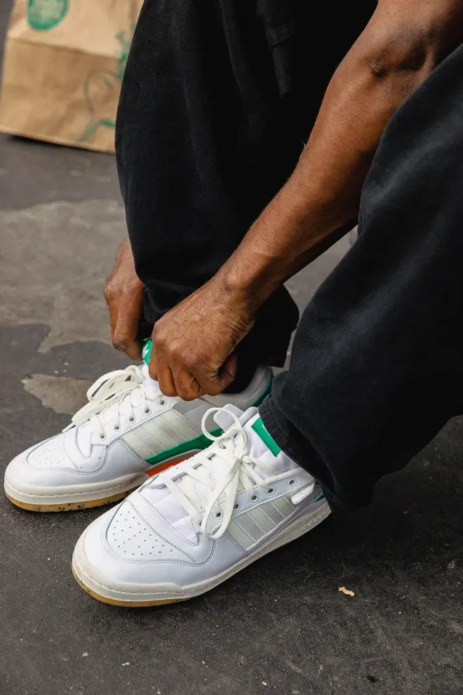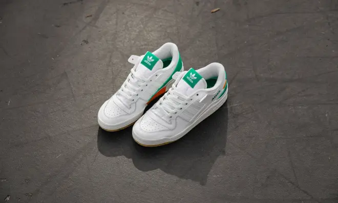 Atlas 合作款 Forum 84 Low ADV 采用了混合皮革我材质制成,鞋面由干净的白色帆色为主,缀以亮色的绿与橙。看起来简洁舒适,具有高级感。