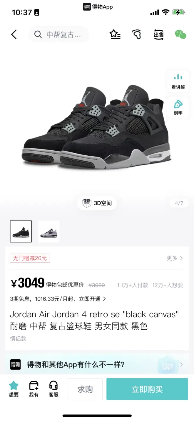 AJ 4 作为一款非常经典的Jordan 正代鞋款,近几年的鞋款联名和不断变换的材质,做的还是可圈可点。去年的“Black Canvas” ,在二级市场现在也依旧是处于溢价的状态。