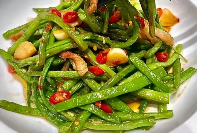 食材:芸豆、小米椒、黄干椒粉、五花肉丝,大蒜